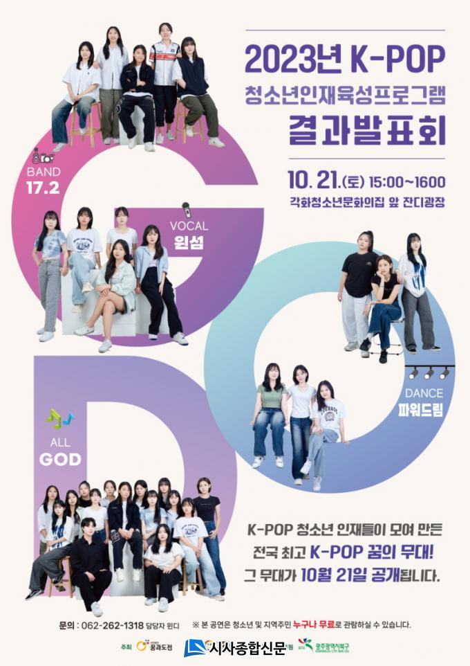 ¡®2023 K-POP û¼Ò³â ÀÎÀçÀ°¼º ÇÁ·Î±×·¥ °á°ú¹ßǥȸ¡¯´Â ¿À´Â 10¿ù 21ÀÏ(Åä) 15½ÃºÎÅÍ ±¤ÁÖ±¤¿ª½Ã°¢Èû¼Ò³â¹®ÈÀÇÁý Á¤¹® ¾Õ Àܵð±¤Àå¿¡¼ ÁøÇàµÇ¸ç, ´í½º¡¤º¸Ä᤹êµå °¢ ºÐ¾ßÀÇ ¹«´ë¿Í ±¤ÁÖ ÃÖÃÊÀÇ K-POP ÇÕµ¿ ÆÛÆ÷¸Õ½º°¡ ¿¹Á¤µÇ¾î ÀÖ´Ù.