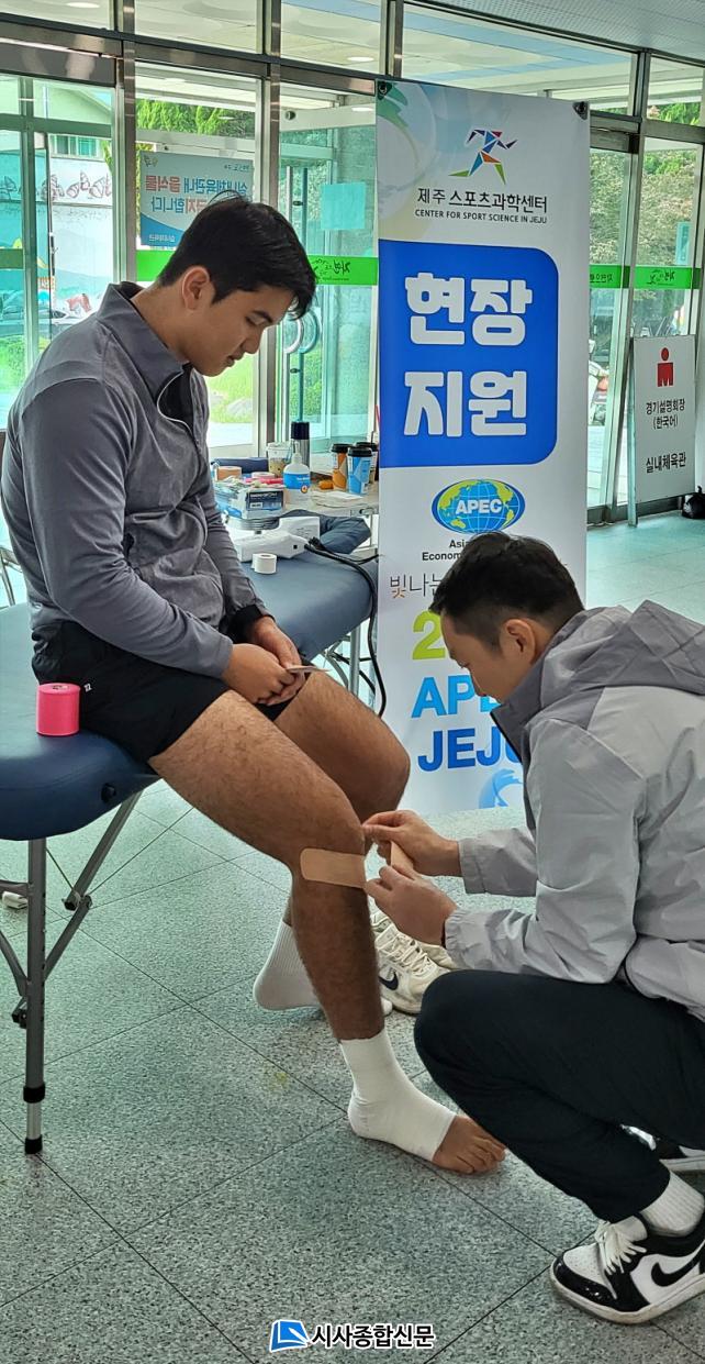 | Á¦ÁÖ½ºÆ÷Ã÷°úÇм¾ÅÍ ÇöÀåÁö¿øÆÀÀÌ ÀÌÈ£»ó ¼±¼ö¿¡°Ô Å×ÀÌÇΠóġ¸¦ Çϰí ÀÖ´Ù. |