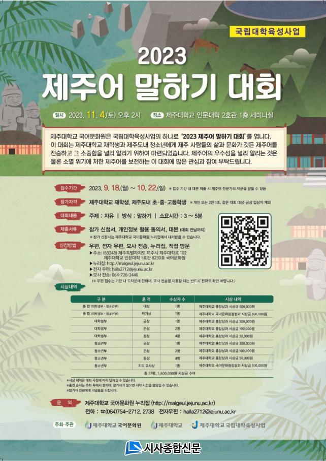 [½Ã»çÁ¾ÇսŹ® = °í¼º¹Î ±âÀÚ] Á¦ÁÖ´ëÇб³ ±¹¾î¹®È¿ø(¿øÀå ¹è¿µÈ¯)Àº ÀçÇлý°ú Á¦ÁÖµµ³» û¼Ò³âÀ» ´ë»óÀ¸·Î ¿À´Â 11¿ù 4ÀÏ ¿ÀÈÄ 2½Ã Àι®´ëÇÐ 2È£°ü ¼¼¹Ì³ª½Ç¿¡¼ ¡®2023 Á¦ÁÖ¾î ¸»Çϱ⠴ëȸ¡¯¸¦ °³ÃÖÇÑ´Ù.