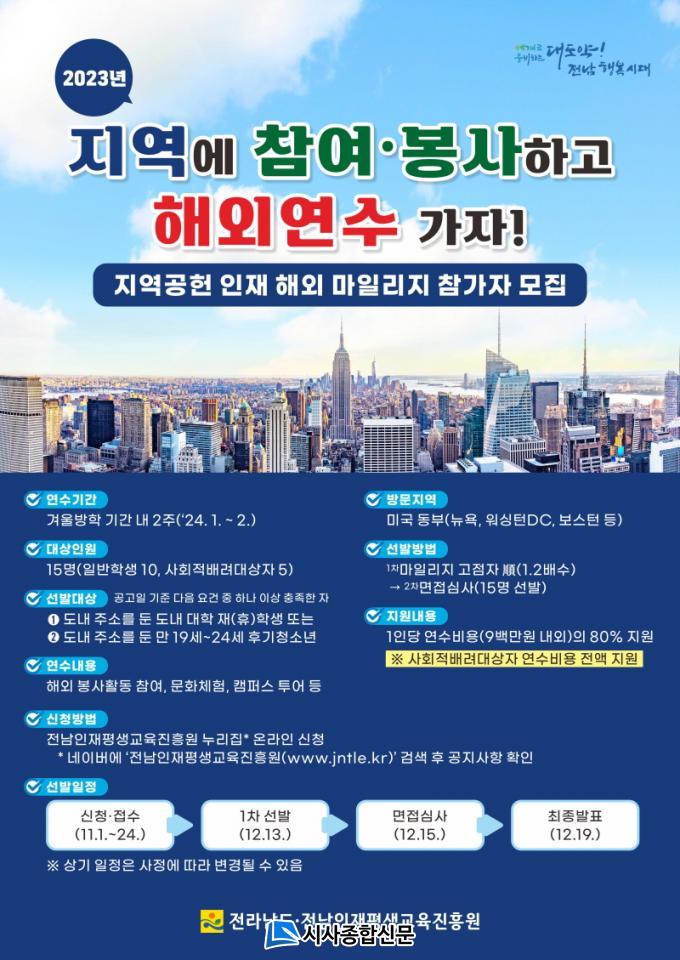 Àü³²µµÀÇ ¡®Áö¿ª°øÇå ÀÎÀç ÇØ¿Ü ¸¶Àϸ®Áö¡¯´Â Áö¿ª°øµ¿Ã¼¿¡ Âü¿©ÇÏ°í ºÀ»çÇÑ ½ÇÀûÀ» Åä´ë·Î Áö¿ª û¼Ò³â¿¡°Ô ¼±ÁøÁö ÇØ¿Ü¿¬¼ö ±âȸ¸¦ Á¦°øÇÏ´Â »ç¾÷ÀÌ´Ù.