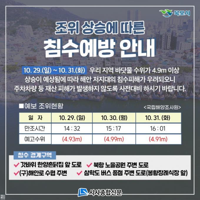 [½Ã»çÁ¾ÇսŹ® = ¿À½ÂÅà ±âÀÚ] ¸ñÆ÷½Ã´Â ´ëÁ¶±âÀÎ ¿À´Â 29ÀϺÎÅÍ 31ÀϱîÁö (¿ÀÈÄ 1½Ã ~ 6½Ã) »çÀÌ ¹Ù´å¹° ¼öÀ§°¡ 4.9m ÀÌ»ó (Á¶¼®Ç¥»ó 10/30 ÃÖ°í 4.99m) »ó½Â ¿¹»óµÊ¿¡ µû¶ó ÇÇÇØ¸¦ ÀÔÁö ¾Êµµ·Ï öÀúÇÑ ´ëºñ¸¦ ´çºÎÇß´Ù.