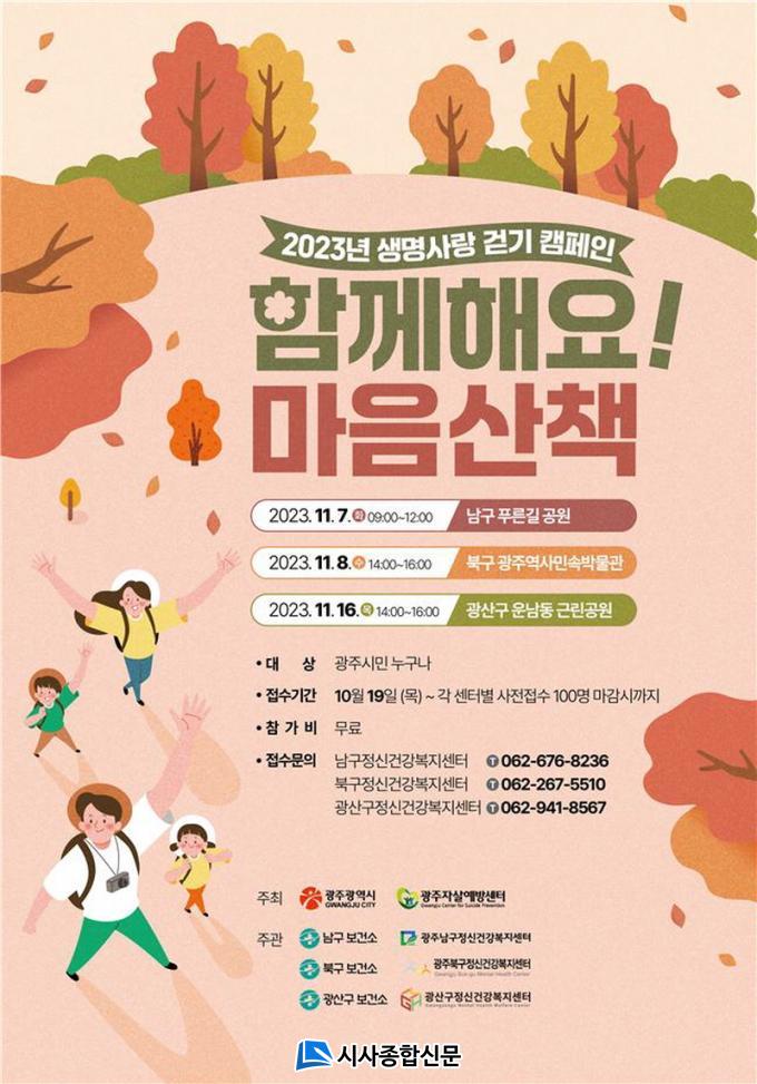 ±¤ÁÖ½Ã, ±¤ÁÖÀڻ쿹¹æ¼¾ÅÍ, 3°³ ÀÚÄ¡±¸(³²±¸, ºÏ±¸, ±¤»ê±¸) Á¤½Å°Ç°º¹Áö¼¾ÅÍ °øµ¿ ÁÖ°üÀ¸·Î ¸¶·ÃµÈ À̹ø Çà»ç´Â ¡®ÇÔ²²ÇØ¿ä! ¸¶À½»êÃ¥!¡¯À» ÁÖÁ¦·Î ¿¸°´Ù. ƯÈ÷ Áö¿ª Áֹεé°ú ÇÔ²² Àڻ쿹¹æ¿¡ ÁÁÀº ¡®°È±â¡¯¸¦ ½ÇõÇÏ¸é¼ Àڻ쿹¹æ¿¡ ´ëÇÑ ÀÎ½Ä °³¼±, ¿¹¹æÀÇ Á߿伺 µîÀ» È«º¸ÇÑ´Ù.