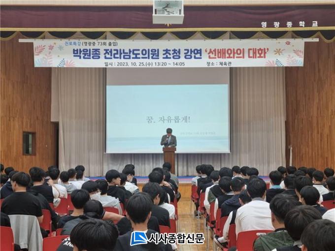 [½Ã»çÁ¾ÇսŹ® = ¿À½ÂÅà ±âÀÚ] Àü¶ó³²µµÀÇȸ ±âȹÇàÁ¤À§¿øÈ¸ ¹Ú¿øÁ¾ ÀÇ¿ø(´õºÒ¾î¹ÎÁÖ´ç, ¿µ±¤1)ÀÌ Áö³ 10¿ù 25ÀÏ ¸ð±³ÀÎ ¿µ±¤±º ¿µ±¤ÁßÇб³¸¦ ã¾Æ ÈĹèµé°ú ¡®²Þ. ÀÚÀ¯·Ó°Ô!¡¯ ¶ó´Â ÁÖÁ¦·Î Áø¼ÖÇÑ ´ëȸ¦ ³ª´³´Ù.