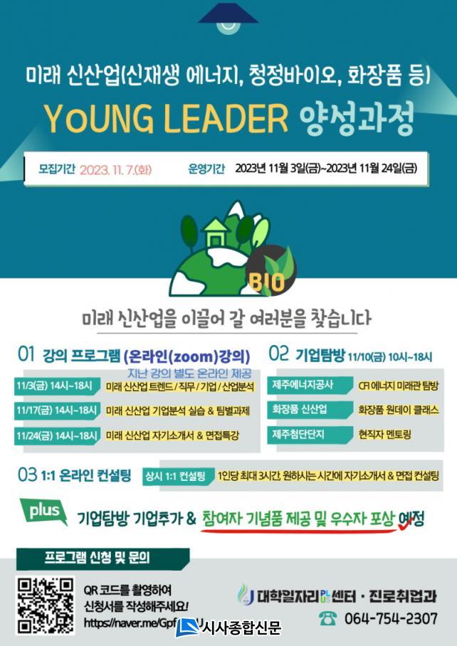 [½Ã»çÁ¾ÇսŹ® = °í¼º¹Î ±âÀÚ] Á¦ÁÖ´ëÇб³ ´ëÇÐÀÏÀÚ¸®Ç÷¯½º¼¾ÅÍ(¼¾ÅÍÀå ¿©ÀαÔ)´Â Á¦ÁÖÁö¿ª ¹× ´ëÇÐÀÇ Æ¯¼º°ú °Á¡À» »ì·Á Ãë¾÷ °æÀï·ÂÀ» È®º¸ÇϰíÀÚ ¡®¹Ì·¡ ½Å»ê¾÷ Young Leader¡¯ ¾ç¼º°úÁ¤À» ¿À´Â 24ÀϱîÁö ¸ÅÁÖ ±Ý¿äÀÏ ¿Â¶óÀÎÀ¸·Î ¿î¿µÇÑ´Ù°í ¹àÇû´Ù.