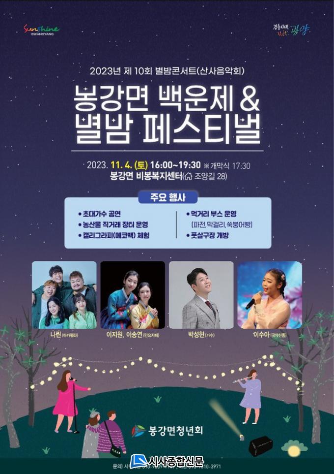 Àü¶ó³²µµ¿Í ±¤¾ç½Ã°¡ ÁÖÃÖÇÏ°í ºÀ°¸é û³âȸ°¡ ÁÖ°üÇÏ´Â À̹ø Çà»ç´Â ºÀ°ÃʵîÇлýÀÇ »ç¹°³îÀÌ, À̼ö¾Æ ±¹¾Ç ½Åµ¿ÀÇ ½ÄÀü °ø¿¬À» ½ÃÀÛÀ¸·Î ºÀ°¸é ÁÖ¹ÎÀÇ ÁÜ¹Ù´í½º, ±âŸ °ø¿¬ µîÀ¸·Î ²Ù¸çÁø´Ù. ¶Ç ³ó»ê¹°Á÷°Å·¡ÀåÅÍ, õü¸Á¿ø°æ ¹× ͏®±×·¡ÇÇ Ã¼Ç踶´ç, ¸Ô°Å¸® ³ª´® ¸¶´ç µîÀÌ Çà»çÀåÀ» ¹æ¹®ÇÑ ½Ã¹ÎµéÀÇ ´«±æÀ» »ç·ÎÀâÀ» °èȹÀÌ´Ù.