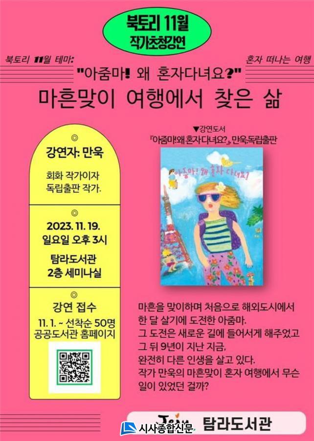11¿ù ºÏÅ丮 Å׸¶´Â ¡®È¥ÀÚ ¶°³ª´Â ¿©Ç࡯À¸·Î, ¸¶ÈçÀ» ¸ÂÀÌÇØ ÇØ¿Ü µµ½Ã¿¡¼ È¥ÀÚ ÇÑ ´Þ »ì±â¿¡ µµÀüÇÑ ¡®¾ÆÁܸ¶¡¯ÀÇ À̾߱⸦ ´ãÀº Ã¥¡º¾ÆÁܸ¶! ¿Ö È¥ÀÚ ´Ù³à¿ä?¡»ÀÇ ÀúÀÚÀÎ È¸È ÀÛ°¡ ¡®¸¸¿í¡¯À» ÃÊÃ»ÇØ °¿¬À» ÁøÇàÇÑ´Ù.