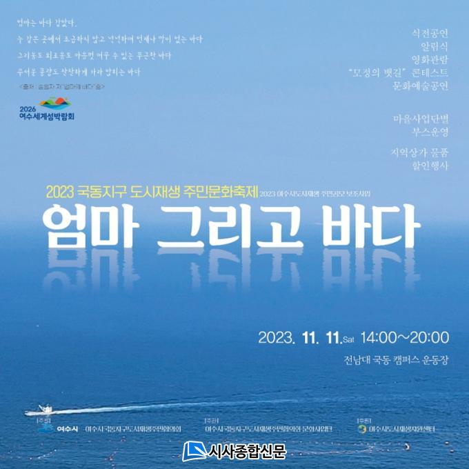 | ¿©¼ö½Ã ±¹µ¿Áö±¸ µµ½ÃÀç»ý Áֹι®ÈÃàÁ¦ ¡®¾ö¸¶ ±×¸®°í ¹Ù´Ù¡¯°¡ ¿À´Â 11ÀÏ(Åä) ¿ÀÈÄ 2½Ã¿¡ Àü³²´ë ±¹µ¿Ä·ÆÛ½º ¿îµ¿Àå¿¡¼ ¿¸°´Ù. |