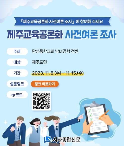 Áö³ 11¿ù 6ÀÏ(¿ù) Á¦ÁÖ±³À°°ø·ÐÈÀ§¿øÈ¸ ¼ÒÀ§¿øÈ¸¸¦ ¿¾î »çÀü¿©·ÐÁ¶»ç ¼³¹® ¹®Ç×À» È®Á¤ÇÏ¿´À¸¸ç, ÃʵîÇб³ 4Çгâ~ÁßÇб³ 3Çгâ, À¯¡¤ÃÊ¡¤ÁßÇб³ Çкθð, ÃÊ¡¤ÁßÇб³ ±³Á÷¿ø, ÀÏ¹Ý µµ¹ÎÀ¸·Î ´ë»óÀ¸·Î ÀÌ·ç¾îÁö¸ç µµ±³À°Ã» ¹× °¢±ÞÇб³ ȨÆäÀÌÁö, µµÃ»ÀÇ ¹è³Ê QRÄÚµå·Î Á¢¼ÓÇÏ¿© Âü¿©ÇÒ ¼ö ÀÖ´Ù.