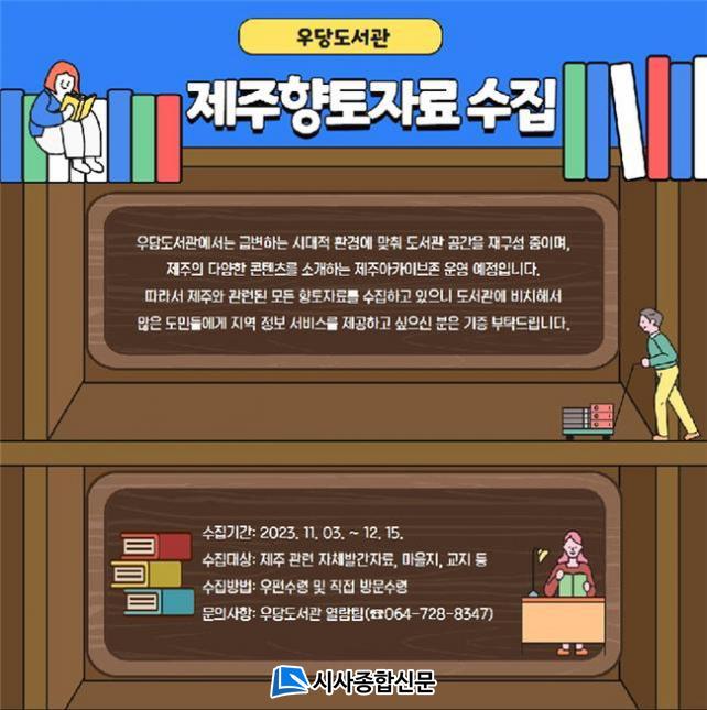 ¼öÁý ÀÚ·á´Â ¸¶À»Áö, ±³Áö, Á·º¸, Áö¿ªÀÛ°¡ ÀÛǰ µî ¸ðµç Á¦ÁÖ °ü·Ã ÀÚ·áÀ̸ç, ¼öÁýµÈ ÀÚ·á´Â ¿ì´çµµ¼°ü Á¦ÁÖ¾ÆÄ«À̺êÁ¸¿¡ ºñÄ¡µÅ ÇâÅä»ç¸¦ ¿¬±¸ÇÏ´Â ÇÐÀÚ, ¿¹¼ú°¡ µî Á¤º¸¼ºñ½º°¡ ÇÊ¿äÇÑ ½Ã¹Îµé¿¡°Ô Á¦°øÇÏ°Ô µÈ´Ù. ÀÚ·á ±âÁõÀ» ¿øÇÏ´Â ½Ã¹ÎÀº 12¿ù 15ÀϱîÁö ¿ìÆíÀ̳ª ¹æ¹®¼ö·ÉÀ» ÅëÇØ °¡´ÉÇϸç, °ü·Ã ¹®ÀÇ»çÇ×Àº ¿ì´çµµ¼°üÀ¸·Î ÇÏ¸é µÈ´Ù.