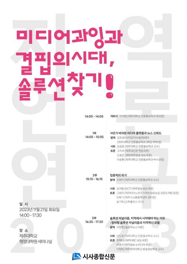 Á¦1ÁÖÁ¦¿¡¼´Â ¡®MZ°¡ ¹Ù¶óº» ¹Ìµð¾î Ç÷§Æû°ú ´º½º ½Å·Úµµ¡¯¸¦ ÁÖÁ¦·Î Á¦ÁÖ´ëÇб³ ¾ð·ÐÈ«º¸Çаú ±èÀ¯°æ, ¼Áö¹Î, ÀÌ´©¸², Á·¹¾Æ ÇлýÀÌ ¹ßÇ¥ÇÑ´Ù. À̹ø ÁÖÁ¦ ¹ßÇ¥´Â MZ¼¼´ëµéÀÇ ´º½º ¼Òºñ ÇàŸ¦ Á÷Á¢ Á¶»çÇÏ°í ¹ßÇ¥ÇÑ´Ù´Â µ¥¿¡ Àǹ̰¡ ÀÖ´Ù. ±è°æÈ£ Á¦ÁÖ´ëÇб³ ¾ð·ÐÈ«º¸Çаú ±³¼öÀÇ »çȸ·Î ½ÃÀ۵Ǹç, Åä·Ð¿¡´Â °íÁö¿ì Á¦ÁÖ´ë½Å¹® ÆíÁý±¹Àå, ½ÅÈ¿Àº JIBSÁ¦ÁÖ¹æ¼Û º¸µµ±¹Àå, À̽Âȯ Á¦ÁÖ´ëÇб³ ¾ð·ÐÈ«º¸Çаú ¹Ú»ç°úÁ¤ ´ëÇпø»ýÀÌ Âü¿©ÇÑ´Ù.