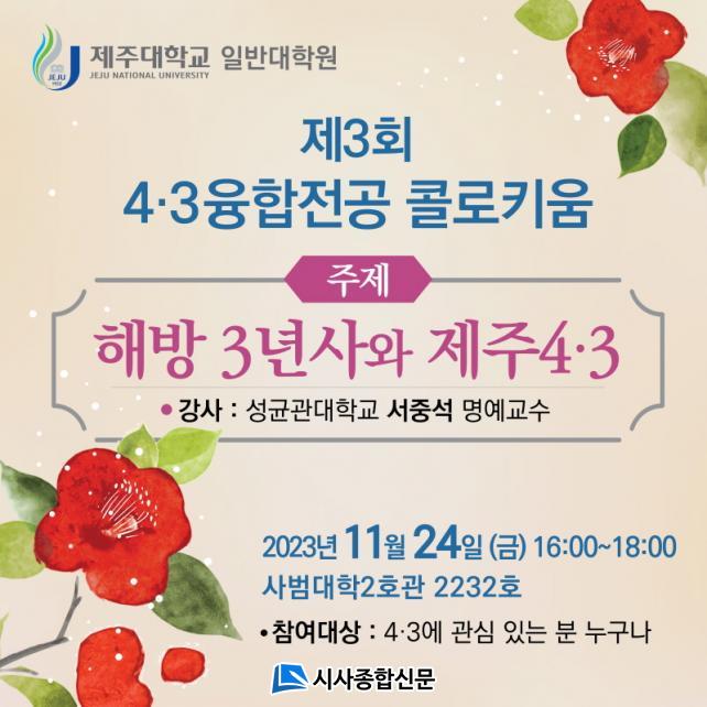 À̹ø ÄÝ·ÎŰ¿òÀº ¡®Çѱ¹Çö´ë»ç 1È£ ¹Ú»ç¡¯·Î ºÒ¸®´Â ¼º±Õ°ü´ëÇб³ »çÇаú ¼Áß¼® ¸í¿¹±³¼ö¸¦ ÃÊûÇÏ¿© ¡®Çعæ 3³â»ç¿Í Á¦ÁÖ4¡¤3¡¯À̶ó´Â ÁÖÁ¦ÀÇ °¿¬À» µè´Â ÀÚ¸®·Î ¸¶·ÃµÈ´Ù. ¼ ±³¼ö´Â ¡â ¿ª»ç¹®Á¦¿¬±¸¼Ò ÀÌ»çÀå, ¡â Á¦ÁÖ4¡¤3»ç°ÇÁø»ó±Ô¸í¹×Èñ»ýÀÚ¸í¿¹È¸º¹À§¿øÈ¸ À§¿ø, ¡â ¡®¾à»ê ±è¿øºÀ°ú ÇÔ²²¡¯ °øµ¿´ëÇ¥·Î Ȱµ¿Çϰí ÀÖ´Ù.