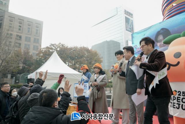 ¿À¿µÈÆ Á¦ÁÖµµÁö»ç¿Í Á¦ÁÖ °íÇâ»ç¶û±âºÎ È«º¸´ë»çÀÎ ¹è¿ì ÀçÈñ¾¾°¡ À̳¯ Çà»çÀå¿¡¼ ÄûÁ ³»°í È«º¸¹°Ç°À» ÁõÁ¤ÇÏ´Â ±ô¦ À̺¥Æ®¸¦ ÁøÇàÇßÀ¸¸ç, È«º¸ ºÎ½º µîÀ» µÑ·¯º¸¸ç ¹æ¹®°´µé¿¡°Ô Á¦ÁÖ °íÇâ»ç¶û±âºÎ Âü¿©¸¦ µ¶·ÁÇϰí 2025 ¾Æ½Ã¾ÆÅÂÆò¾ç°æÁ¦Çù·Âü(APEC) Á¤»óȸÀÇ Á¦ÁÖ À¯Ä¡µµ È«º¸Çß´Ù.