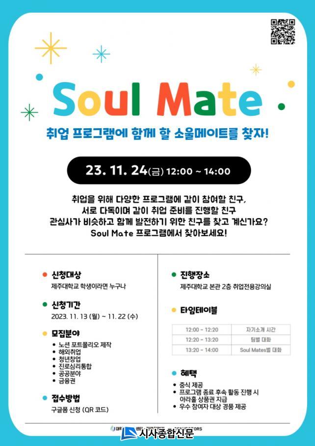 Soul Mate ÇÁ·Î±×·¥Àº ¿À´Â 23ÀϱîÁö Âü¿©ÇÒ ÇлýµéÀ» ¸ðÁý ÁßÀÌ´Ù. Áø·Î°¡ ¸íÈ®ÇÏÁö ¾Ê°Å³ª Ãë¾÷Áغñ¸¦ ÇÔ²² ÇÒ µ¿·á(Mate)¸¦ ã°í ½ÍÀº ÀçÇлý, ÈÞÇлý, Á¹¾÷»ý ´©±¸³ª ½Åû °¡´ÉÇÏ´Ù. ÀÚ¼¼ÇÑ ³»¿ëÀº Á¦ÁÖ´ëÇб³ ȨÆäÀÌÁö °øÁö»çÇ×À» ÅëÇØ È®ÀÎÇÒ ¼ö ÀÖ´Ù.
