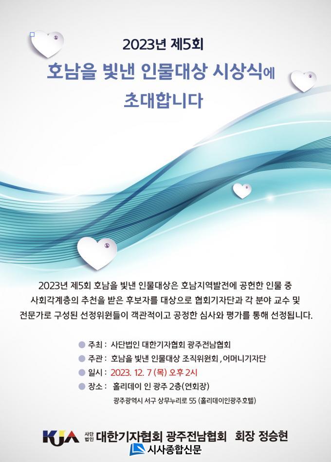 ÇÑÆí, »ç´Ü¹ýÀÎ ´ëÇѱâÀÚÇùȸ ±¤ÁÖ¡¤Àü³²Çùȸ°¡ ÁÖÃÖÇÑ ¡®2023³â Á¦5ȸ È£³²À» ºû³½ Àι°´ë»ó¡¯ ½Ã»ó½ÄÀº ¿À´Â 12¿ù 07ÀÏ(±Ý) ¿ÀÈÄ 2½Ã ±¤Áֽà ¼±¸ Ä¡Æòµ¿¿¡ À§Ä¡ÇÑ È¦¸®µ¥ÀÌ ÀÎ ±¤ÁÖÈ£ÅÚ 2Ãþ ¿¬È¸Àå¿¡¼ °³ÃֵȴÙ.