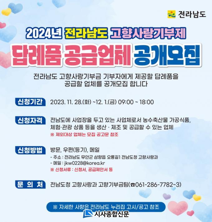 ´ä·Êǰ °ø±Þ¾÷ü ¸ðÁýÀº 12¿ù 1ÀÏ ¿ÀÈÄ 6½Ã±îÁö¸ç, Àü³²µµÃ» °íÇâ»ç¶û°ú¿¡ Á÷Á¢ ¹æ¹® ¶Ç´Â ¸ÞÀÏ(jkw0228@korea.kr)À» ÅëÇØ ½Åû °¡´ÉÇÏ´Ù.