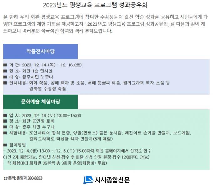 ±¤ÁÖÇлý±³À°¹®Èȸ°ü ±è¿ëÀÏ °üÀåÀº ¡°À̹ø ¼º°ú°øÀ¯È¸°¡ ¼ö°»ýµéÀÌ ¼ºÃë°¨°ú Áö¼ÓÀûÀÎ ÇнÀ µ¿±â°¡ µÇ±æ ¹Ù¶õ´Ù¡±¸ç ¡°¶Ç Æò»ý±³À°¿¡ ´ëÇÑ ½Ã¹ÎµéÀÇ Âü¿©°¡ ´õ¿í È®´ëµÇ´Â °è±â°¡ µÆÀ¸¸é ÇÑ´Ù¡±°í ¹àÇû´Ù.