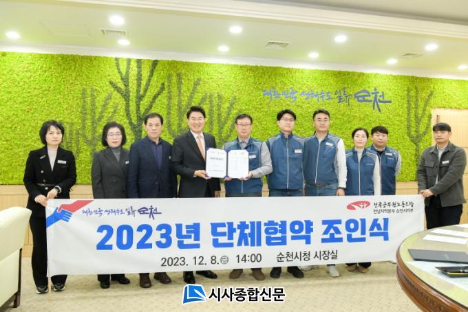 [½Ã»çÁ¾ÇսŹ® = Àå¹Î±Ô ±âÀÚ] ¼øÃµ½Ã(½ÃÀå ³ë°ü±Ô)¿Í Àü±¹°ø¹«¿ø³ëµ¿Á¶ÇÕ ¼øÃµ½ÃÁöºÎ(ÁöºÎÀå ¹®º´Èñ)´Â 12¿ù 8ÀÏ ¼øÃµ½Ãû ½ÃÀå½Ç¿¡¼ ´ÜüÇù¾à Á¶ÀνÄÀ» °®°í ¡®2023³â °ø¹«¿ø ´ÜüÇù¾à¡¯À» ü°áÇß´Ù.