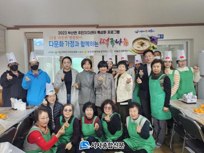 À̳¯ Çà»ç´Â 2023³â ºÎ»ê¸é ÁÖ¹ÎÀÚÄ¡¼¾ÅÍ Æ¯¼ºÈ»ç¾÷À¸·Î ¼±Á¤µÈ ¡®´Ù¹®È°¡Á¤°ú ÇÔ²²ÇÏ´Â ÀüÅëÀ½½Ä ³ª´©±â¡¯ »ç¾÷À¸·Î ÃßÁøµÆ´Ù. ºÎ»ê¸é ÁÖ¹ÎÀÚÄ¡À§¿øÈ¸(À§¿øÀå ¿©¸í±¸)¿¡¼ ÁÖ°üÇÏ°í ºÎ»ê¸é »õ¸¶À»ÇùÀÇȸ(ȸÀå ±è½Â¿Á)°ú ºÎ³àȸ(ȸÀå ±Ç¼º¼ø), ÀåÈﱺ°¡Á·¼¾ÅÍ(¼¾ÅÍÀå ¹ÚÇý¿µ)¿¡¼ ÈÄ¿øÇß´Ù.