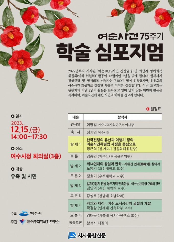 À̹ø Çà»ç´Â ¿©¼ö¡¤¼øÃµ 10¡¤19»ç°Ç Áø»ó±Ô¸í ¹× Èñ»ýÀÚ ¸í¿¹È¸º¹À§¿øÈ¸(ÀÌÇÏ ¿©¼ø»ç°ÇÀ§¿øÈ¸)ÀÇ 2³â°£ÀÇ È°µ¿À» µ¹¾Æº¸°í ÇâÈÄ È°µ¿¹æÇâ¿¡ ´ëÇØ ³íÀÇÇϸç, ¿©¼ø»ç°ÇÀÇ Áø»óÀ» »ìÆìº½À¸·Î½á ¿©¼ø»ç°Ç¿¡ ´ëÇÑ ½Ã¹ÎµéÀÇ ÀÌÇØ¸¦ µ½±â À§ÇØ ¸¶·ÃµÆ´Ù. Çà»ç´Â Á¤±Ù½Ä Àü)Áø½ÇÈÇØ¸¦À§ÇѰú°Å»çÁ¤¸®À§¿øÈ¸ À§¿øÀåÀÇ ¡®Çѱ¹ÀüÀïÀÇ À¯»ê°ú ÀÌÇà±â Á¤ÀÇ: ¿©¼ø»ç°ÇƯº°¹ý Á¦Á¤À» Áß½ÉÀ¸·Î¡¯ ±âÁ¶¹ßÁ¦¿¡ À̾î ÃÑ 4°³ ÁÖÁ¦ ¹ßÇ¥·Î ÁøÇàµÈ´Ù.