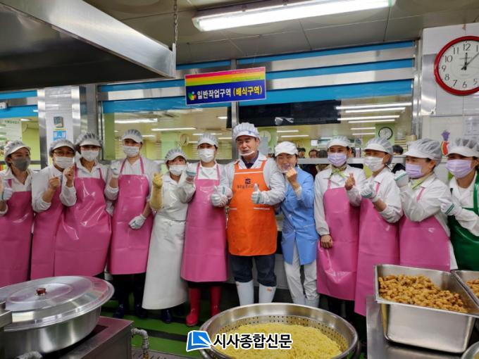 ÀÌ ±³À°°¨Àº À̳¯ À§»ýº¹°ú À§»ý¸ð, À§»ý ¸¶½ºÅ©¸¦ Âø¿ëÇϰí Á¶¸®Á¾»ç¿ø°ú ÇÔ²² Çлýµé¿¡°Ô ÀÏÀÏÀÌ Á¡½ÉÀ» ¹è½ÄÇÏ¸é¼ ¡°Á¡½É ¸ÀÀÖ°Ô ¸Ô¾î¿ä¡±, ¡°Àß ¸Ô¾î¾ß °Ç°Çϰí ÇູÇÕ´Ï´Ù¡±°í ÇлýµéÀ» ÀÀ¿øÇß´Ù.