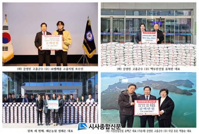 22ÀÏ °íÈﱺ¿¡ µû¸£¸é ¡ãskÅÚ·¹ÄÞ °íÈïÁöÁ¡ Á÷¿ø(Á¶¼öÀÎ) 300¸¸ ¿ø ¡ã¹ý¹«ºÎ û¼Ò³â ¹üÁË¿¹¹æ °íÈïÁö±¸ ȸÀå(Á¶±¤¿µ) 200¸¸ ¿ø ¡ã´ëÁ¤ÀÌ¿£¾¾(´ëÇ¥ ±è³²¿) 200¸¸ ¿ø ¡ã¹éµÎ»ê°Ç¼³ (´ëÇ¥ À¯º¹¸¸) ¹é¹Ì 10kg 200Æ÷(500¸¸ ¿ø »ó´ç) ¡ã¿À¼º°ÇÃàÀÚÀç(´ëÇ¥ Á¶½Â±â) ÄíŰ¡¤¿À¶õ´Ù °úÀÚ °¢ 100°³(590¸¸ ¿ø »ó´ç) ¡ãÇýÀº³ó¿ø(´ëÇ¥ Á¤ÇýÀº) ¹«±èÄ¡ 900kg°ú ±èÀå¿ë »ý¹« 3Åæ(700¸¸ ¿ø »ó´ç) ¡ã°Å¼º»ê¾÷°Ç¼³(´ëÇ¥ À¯¹é±Ù)°ú ½Ä´ç µ·µ·(´ëÇ¥ ¹ÚºÀ¼ø) 300¸¸ ¿øÀ» ±âŹÇß´Ù°í ÀüÇß´Ù.