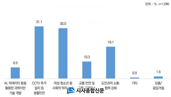 ¹üÁË¿¹¹æÀÇ È¿°úÀûÀÎ Ä¡¾È Á¤Ã¥Àº ¡®¹üÁË ¿¹¹æ ½Ã¼³ ¼³Ä¡¡¯(41.4%), ¡®¾î¸£½Å ´ë»ó ¹üÁË ¿¹¹æ ¼øÂû¡¯(30%), ¡®¸ÂÃãÇü Ä¡¾È ¼ºñ½º Á¦°ø¡¯(20.3%) ¼øÀ¸·Î ´äÇß´Ù.