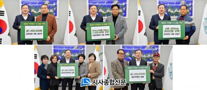 ´ã¾ç±ºÀº °¨·Î³óÀå(´ëÇ¥ ¼ÛÀÎÁÖ), ´ã¾ç±º¿©¼ºÃà»êȸ(ȸÀå ½Å³²¼ø), Èæ¿°¼ÒÇùȸ ´ã¾çÁöºÎ(ȸÀå Á¤¿ëȯ)¿¡¼ Çö±Ý °¢ 100¸¸ ¿ø, ÇÑ¿ì³ó°¡(´ëÇ¥ ±èÀϰï)¿¡¼ ¼Ò»À 400»óÀÚ(800¸¸ ¿ø »ó´ç), ÇÁ·ÎƾÆÑÅ丮(´ëÇ¥ ÃÖ¿õö)¿¡¼ ¶óÀ̽º ½Ã¸®¾ó 80»óÀÚ(152¸¸ ¿ø »ó´ç)À» ±âŹÇß´Ù°í ÀüÇß´Ù.