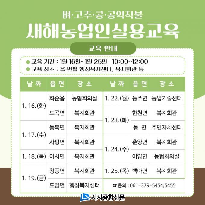 À̹ø ±³À°Àº ³ó¾÷±â¼ú¼¾Å͸¦ Æ÷ÇÔÇÏ¿© °¢ À¾¡¤¸é º¹Áöȸ°ü°ú ÇàÁ¤º¹Áö¼¾ÅÍ µî¿¡¼ ÁøÇàµÇ¸ç, º, °íÃß, Äá, °øÀÍÁ÷ºÒ µî 4°³ °úÁ¤¿¡ ´ëÇØ ´Ù·é´Ù. ƯÈ÷, ¿ÃÇØ »õÇØ ³ó¾÷ÀÎ ½Ç¿ë ±³À°Àº °øÀÍÁ÷ºÒ ±³À°À» ¿¬°èÇÏ¿© ±×°£ µû·Î ¹Þ¾Æ¾ß Çß´ø Àǹ«±³À°À» ÇÑ °÷¿¡¼ ¹ÞÀ» ¼ö ÀÖ°Ô µÇ¾ú´Ù. ÀÏÁ¤Àº 1¿ù 16ÀÏ È¼øÀ¾°ú µµ°î¸éÀ» ½ÃÀÛÀ¸·Î 25ÀÏ ¹é¾Æ¸é±îÁö 13°³ À¾¡¤¸é¿¡¼ ÁøÇàµÈ´Ù.