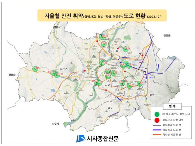 ±¤ÁÖ±¤¿ª½Ã(½ÃÀå °±âÁ¤)´Â ÃÖ±Ù 5³â°£ µ¿Àý±â(12~3¿ù) °ø°ø¡¤¹Î°£µ¥ÀÌÅÍ 6Á¾À» ºÐ¼®ÇØ ºÏ±¸ ¾ç»êµ¿(ÇÑÀü À繫ÀÚÀç¼¾ÅÍ ºÎ±Ù) µî °Ü¿ïö ±¤ÁÖÁö¿ª ¾ÈÀü Ãë¾à µµ·Î 18°÷À» µµÃâÇß´Ù. µ¥ÀÌÅÍ ºÐ¼®Àº µµ·Î °áºù »ç°í´Ù¹ß Áö¿ª, »ó½À °áºù¡¤Àû¼³ Ãë¾à µµ·Î, µµ½Ãöµµ 2È£¼± °ø»ç 1´Ü°è ±¸°£ º¹°øÆÇ ¼³Ä¡ Áö¿ª, À¯µ¿Àα¸ µ¥ÀÌÅÍ µîÀ» À¶ÇÕÇØ ¡®µµ·Î ¾ÈÀü Ãë¾àÁö Á¾ÇÕÁö¼ö¡¯¸¦ »êÃâÇß´Ù.