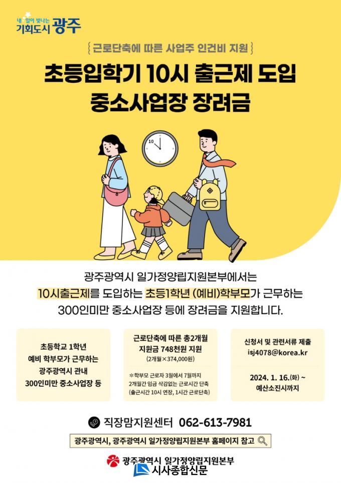 ±¤Áֽà Àϰ¡Á¤ ¾ç¸³ Áö¿øÁ¤Ã¥ÀÎ ¡®Ãʵî1Çгâ Çкθð 10½Ã Ãâ±ÙÁ¦ µµÀÔ Áß¼Ò»ç¾÷Àå Àå·Á±Ý Áö¿ø »ç¾÷¡¯Àº 300ÀÎ ¹Ì¸¸ Áß¼Ò»ç¾÷Àå¿¡¼ ±Ù¹«ÇÏ´Â Ãʵî 1Çгâ Çкθð ±Ù·ÎÀÚ°¡ ÀÔÇбâ(3~7¿ù)¿¡ ÃÖ´ë 2°³¿ù°£ Ãâ±Ù½Ã°£À» 1½Ã°£ ´ÊÃâ ¼ö ÀÖµµ·Ï Áö¿øÇÏ´Â »ç¾÷ÀÌ´Ù.