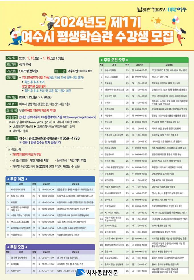 19¼¼ ÀÌ»ó ½Ã¹ÎÀº ´©±¸³ª Âü¿©ÇÒ ¼ö ÀÖÀ¸¸ç, Èñ¸ÁÀÚ´Â ¿À´Â 15ÀϺÎÅÍ 19ÀϱîÁö ¿©¼ö½ÃokÅëÇÕ¿¹¾à½Ã½ºÅÛ(www.yeosu.go.kr/newok)¿¡¼ ½ÅûÇÏ¸é µÈ´Ù. ±âŸ ÀÚ¼¼ÇÑ »çÇ×Àº ½Ã Æò»ý±³À°°ú(¢Ï061-659-4726)·Î ¹®ÀÇÇÏ¸é ¾È³»¹ÞÀ» ¼ö ÀÖ´Ù.
