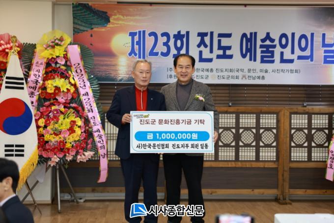Áøµµ±º¿¡ µû¸£¸é Áö¿ª ¿¹¼úÀεéÀÇ ÇÑ ÇØ¸¦ ¸¶¹«¸®ÇÏ´Â 2023³â Áøµµ¿¹¼úÀÎÀÇ ³¯ Çà»ç¿¡¼ Çѱ¹¹®ÀÎÇùȸ ÁøµµÁöºÎ(ÁöºÎÀå ±è¿µ½Â)°¡ 100¸¸¿ø, Çѱ¹¿¹ÃÑ ÁøµµÁöȸ ÀÚ¹®À§¿ø(±è¿ë¿í)ÀÌ ÀÛǰ ÆÇ¸Å¾× 15¸¸¿øÀ» ±âŹÇϰí Çѱ¹±¹¾ÇÇùȸ ÁøµµÁöºÎÀå(ÀÌÈñÃá)Àº 2017³âºÎÅÍ ¸Å³â ¹®ÈÁøÈï±â±Ý¿¡ 100¸¸¿øÀ» ±âÅ¹ÇØ ¿Ô´Ù°í ¹àÇû´Ù.