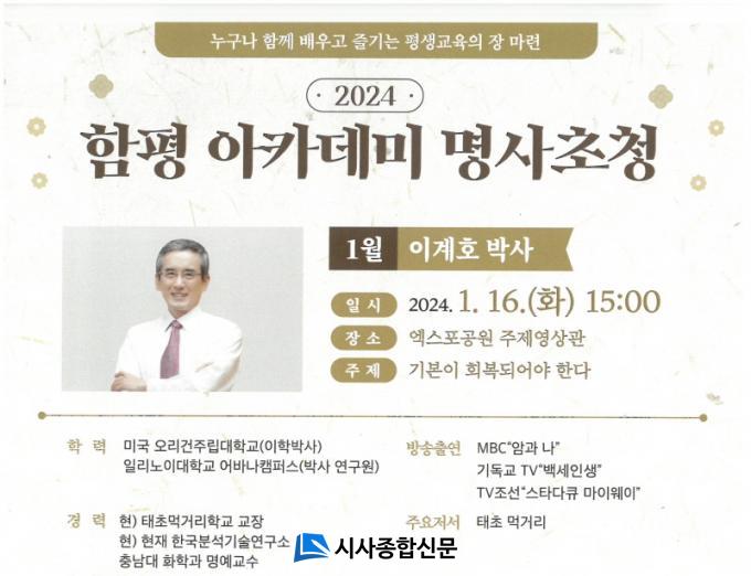 ÇÔÆò±ºÀº ¡°2024³âµµ ¡®ÇÔÆò¾ÆÄ«µ¥¹Ì¡¯°¡ ¿À´Â 1¿ù 16ÀÏ ¿ÀÈÄ 3½Ã¿¡ ÇÔÆò ¿¢½ºÆ÷°ø¿ø ÁÖÁ¦¿µ»ó°ü¿¡¼ °³Ãֵȴ١°°í 12ÀÏ ¹àÇû´Ù. ¿ÃÇØ ù ¹øÂ° °¿¬ÀÚ·Î´Â Ãæ³²´ëÇб³ À̰èÈ£ ±³¼ö¸¦ ÃÊûÇß´Ù. À̰èÈ£ ±³¼ö´Â ¾Ï ¿¹¹æ ¹× Ä¡·á, °Ç°ÇÑ »ýȰ½À°ü¿¡ ´ëÇÑ Æø³ÐÀº Àü¹® Áö½ÄÀ» °®Ãá Àι°·Î, '¹°¹Ú»ç'¿Í '°Ç°Àüµµ»ç'·Îµµ ³Î¸® ¾Ë·ÁÁ® ÀÖ´Ù.