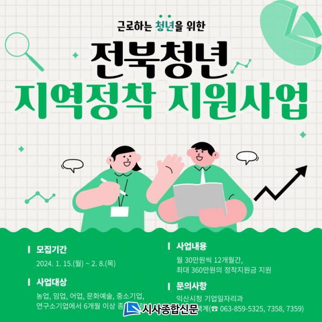 ÀÍ»ê½Ã´Â ¿ù 30¸¸ ¿ø¾¿ 1³â°£ ÃÖ´ë 360¸¸ ¿øÀÇ Á¤ÂøÁö¿ø±ÝÀ» Áö¿øÇÏ´Â 'ÀüºÏû³â Áö¿ªÁ¤Âø Áö¿ø»ç¾÷' Âü¿©ÀÚ¸¦ ¸ðÁýÇÑ´Ù°í 16ÀÏ ¹àÇû´Ù.