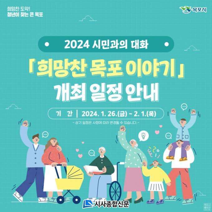 ÇÑÆí, ¸ñÆ÷½Ã´Â 2024³âµµ ½Ã¹Î°úÀÇ ´ëÈ ¼¼ºÎÀÏÁ¤À» ¾È³»ÇÏ°í »çÁ¤¿¡ µû¶ó °³ÃÖ ³¯Â¥¿Í ½Ã°£, Àå¼Ò°¡ º¯°æµÉ ¼ö ÀÖ´Ù°í ÀüÇß´Ù. ¡ã1ÀÏÂ÷ 1¿ù 26ÀÏ(±Ý) ¿¹¼ú¿þµùÄÁº¥¼Ç 6Ãþ(¿ë´ç1µ¿, ¿ë´ç2µ¿, ¿¬µ¿, »ïÇе¿, À̷ε¿, Çϴ絿)¡ã2ÀÏÂ÷ 1¿ù29ÀÏ(¿ù) ¸ñÆ÷¼öÇù(»êÁ¤µ¿, ´ë¼ºµ¿, Á×±³µ¿, ºÏÇ×µ¿, ¸ñ¿øµ¿, µ¿¸íµ¿, ¸¸È£µ¿, À¯´Þµ¿) ¡ã3ÀÏÂ÷ 1¿ù30ÀÏ(È) ¸ñÆ÷Á¾ÇÕ»çȸº¹Áö°ü±³À°°ü(¿¬»êµ¿, ¿ø»êµ¿, ¿ëÇØµ¿) ¡ã4ÀÏÂ÷ 1¿ù31ÀÏ(¼ö) ¿¡¸Þ¶öµå¿þµùȦ(»óµ¿, »ïÇ⵿, ¿Á¾Ïµ¿) ¡ã5ÀÏÂ÷ 2¿ù1ÀÏ(¸ñ) ¼§±×¸®¾ÆºñġȣÅÚ(½ÅÈﵿ, ºÎÈﵿ, ºÎÁÖµ¿)