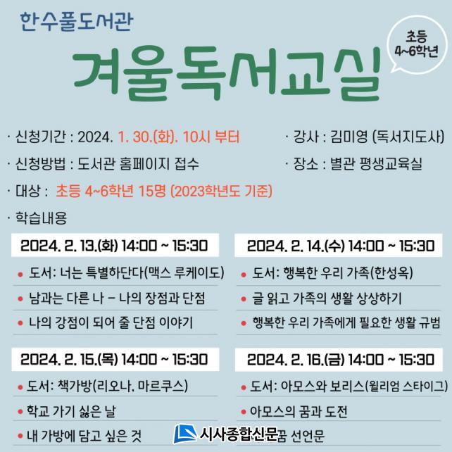 [½Ã»çÁ¾ÇսŹ® = °í¼º¹Î ±âÀÚ] ÇѼöÇ®µµ¼°üÀº ¹æÇÐ µ¿¾È ¿Ã¹Ù¸¥ µ¶¼Áöµµ¸¦ ÅëÇØ ¾î¸°À̵éÀÌ ÀÚ¹ßÀûÀΠå Àб⠽À°üÀ» Çü¼ºÇÏ´Â °è±â¸¦ ¸¶·ÃÇϰíÀÚ¡®2024³â °Ü¿ï µ¶¼ ±³½Ç¡¯À» ¿î¿µÇÒ ¿¹Á¤ÀÌ´Ù.