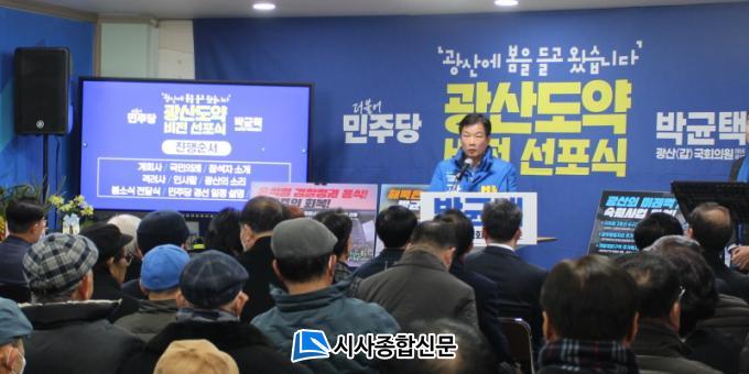 [½Ã»çÁ¾ÇսŹ® = ¿À½ÂÅà ±âÀÚ] Á¦22´ë ±¹È¸ÀÇ¿ø ¼±°Å ±¤»ê°©¿¡ Ã⸶ÇÑ ´õºÒ¾î¹ÎÁÖ´ç ¹Ú±ÕÅà ¿¹ºñÈĺ¸(ÀÌÀç¸í ´ç´ëÇ¥ ¹ý·üƯº¸)´Â 1¿ù 27ÀÏ Åä¿äÀÏ ¿ÀÈÄ 2½Ã ¹Ú±ÕÅà ¿¹ºñÈĺ¸ ¼±°Å»ç¹«½Ç¿¡¼ ¼±´ëº»ºÎ °ü°èÀÚ¿Í ÀÚ¿øºÀ»çÀÚ 500¸íÀÌ Âü¿©ÇÑ °¡¿îµ¥ ¼±´ëº»ºÎ ¹ß´ë½Ä ¡®±¤»ê¿¡ º½À» µé°í ¿Ô½À´Ï´Ù-±¤»êµµ¾à ºñÀü ¼±Æ÷½Ä¡¯À» ¼ºÈ²¸®¿¡ °³ÃÖÇÏ¿´´Ù.