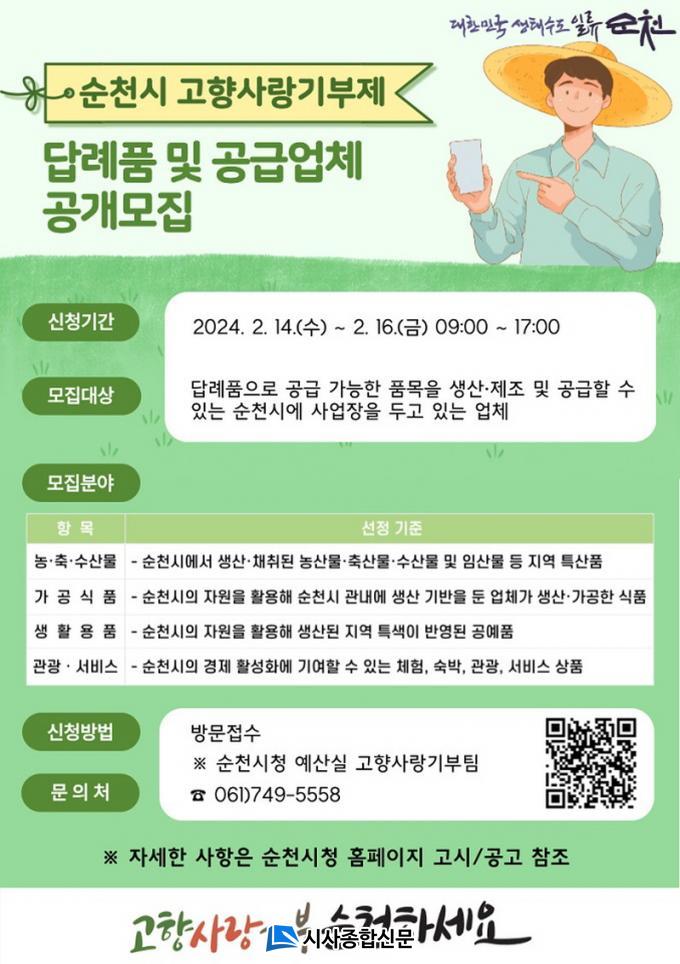 °ø°³¸ðÁý ³»¿ëÀº ¿À´Â 31ÀϺÎÅÍ 2¿ù 16ÀϱîÁö ½Ã ȨÆäÀÌÁö¸¦ ÅëÇØ °ø°íµÇ¸ç, ½Åû ±â°£Àº 2¿ù 14ÀϺÎÅÍ 16ÀϱîÁöÀÌ´Ù. ´ä·ÊǰÀ» Á¦¾ÈÇÏ°í °ø±ÞÀ» ¿øÇÏ´Â ¾÷ü´Â ¼øÃµ½Ãû ¿¹»ê½Ç °íÇâ»ç¶û±âºÎÆÀÀ¸·Î ¹æ¹®ÇØ ½Åû ¼·ù¸¦ Á¦ÃâÇÏ¸é µÈ´Ù.