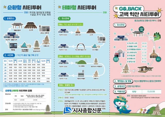 °í¹é ½ÃƼÅõ¾î ¹ö½º´Â ½ÅûÀÚ°¡ 15¸í ÀÌ»óÀÏ °æ¿ì ¿îÇàÇÑ´Ù. ¿îÇàÀÏ ±âÁØ ÀÏÁÖÀÏ Àü±îÁö »çÀü ¿¹¾àÀ» ÇØ¾ß ÇÑ´Ù. ÀÍ»ê½Ã ÅëÇÕ¿¹¾à½Ã½ºÅÛÀ» ÅëÇØ ¿¹¾àÇϰųª ½Ã ¹®È°ü±¤»ê¾÷°ú(063-859-5809, 5810)·Î ¹®ÀÇÇÏ¸é µÈ´Ù. ÀÌ¿Í ÇÔ²² ½Ã´Â ÀÍ»ê 9°æ3¶ôÀ» Áñ±æ ¼ö ÀÖ´Â »õ·Î¿î 1¹Ú2ÀÏ °ü±¤ »óǰµµ °èȹÇϰí ÀÖ´Ù.
