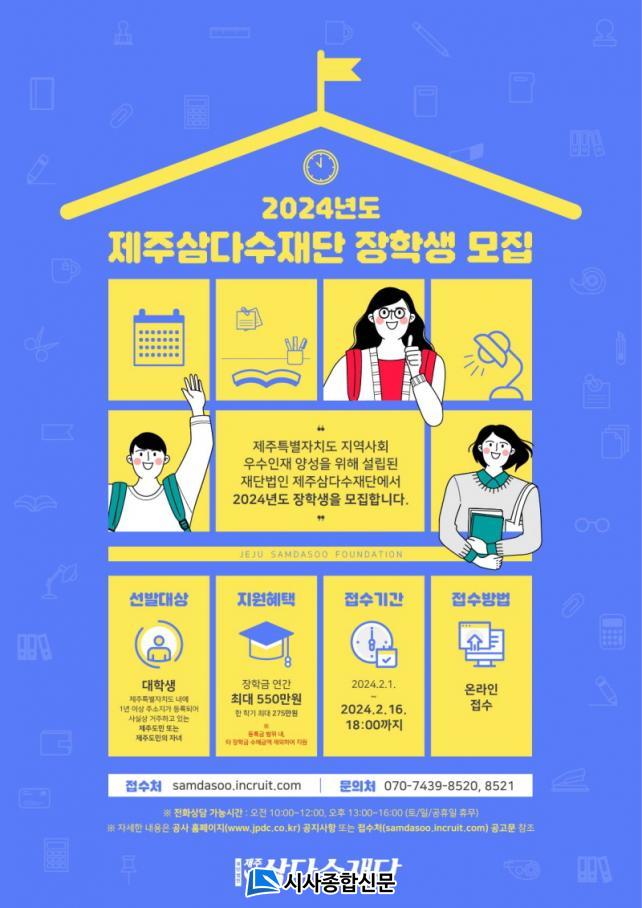 ´ëÇлý ÀåÇлý ½Åû Á¢¼ö´Â 2¿ù 1ÀϺÎÅÍ 2¿ù 16ÀϱîÁö ¿Â¶óÀÎ(samdasoo.incruit.com)À¸·Î ÁøÇàµÇ¸ç, ÀÚ¼¼ÇÑ »çÇ×Àº Á¦ÁÖ°³¹ß°ø»ç ȨÆäÀÌÁö(www.jpdc.co.kr)¿¡¼ È®ÀÎÇÒ ¼ö ÀÖ´Ù.