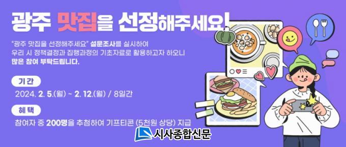 ±¤ÁÖ±¤¿ª½Ã(½ÃÀå °±âÁ¤)´Â 2024³â ¡®±¤ÁÖ ¸ÀÁý¡¯ ¼±Á¤À» À§ÇÑ ¿Â¶óÀÎ ¼³¹®Á¶»ç¸¦ 5ÀϺÎÅÍ 12ÀϱîÁö ½Ç½ÃÇÑ´Ù.