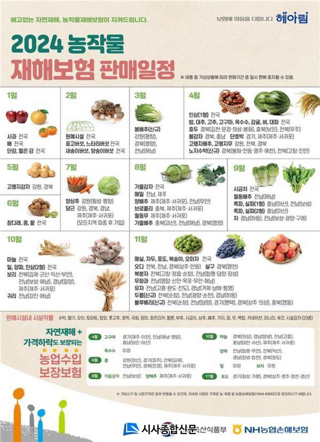 2023³â ÀüºÏƯº°ÀÚÄ¡µµ ³óÀÛ¹°ÀçÇØº¸Çè °¡ÀÔ ¸éÀûÀº 111,213haÀ̰í, 2¸¸8õ¿©³ó°¡°¡ º¸Çè±Ý 1,430¾ï¿øÀ» ¼ö·ÉÇØ ÀÌ»óÀú¿Â¡¤¿ì¹Ú¡¤È£¿ì¡¤ÅÂdz µî ÀÚ¿¬ÀçÇØ·Î ÀÎÇÑ ÇÇÇØ¸¦ º¸»ó¹Þ¾Ò´Ù. 2024³â ÁÖ¿ä ǰ¸ñÀÇ °¡ÀÔ ±â°£Àº ¡ã»ç°ú¡¤¹è¡¤´Ü°¨¡¤¶µÀº°¨ 1¿ù 29ÀÏ~2¿ù 29ÀÏ,¡ã³ó¾÷¿ë ½Ã¼³ ¹× ½Ã¼³ÀÛ¹° 2¿ù~12¿ù, ¡ã°íÃß 4¿ù 15ÀÏ~5¿ù 17ÀÏ, ¡ãº 4¿ù 22ÀÏ~6¿ù 21ÀÏ, ¡ãÄá 6¿ù 10ÀÏ~7¿ù 19ÀÏ, ¡ã¾çÆÄ 10¿ù 21ÀÏ~11¿ù 22ÀÏÀÌ´Ù.