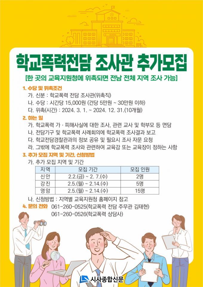 °Áø±³À°Áö¿øÃ»Àº 2¿ù 5ÀÏ(¿ù)ºÎÅÍ 14ÀÏ(¼ö)±îÁö 5¸íÀ» ¸ðÁýÇϰí, ¿µ¾Ï±³À°Áö¿øÃ»Àº °°Àº ±â°£ 15¸íÀ» ¸ðÁýÇÑ´Ù. ¶Ç, ½Å¾È±³À°Ã»Àº 2¿ù 2ÀÏ(±Ý)ºÎÅÍ 7ÀÏ(¼ö)±îÁö 2¸íÀ» ¸ðÁýÇÑ´Ù. À§ÃËµÈ Çб³Æø·ÂÀü´ãÁ¶»ç°üÀº Àü³² Àü Áö¿ª¿¡¼ Ȱµ¿ÀÌ °¡´ÉÇÏ´Ù.