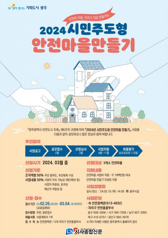 ±¤Áֽð¡ Áö³ÇغÎÅÍ ÃßÁøÇϰí ÀÖ´Â ¡®½Ã¹ÎÁÖµµÇü ¾ÈÀü¸¶À» ¸¸µé±â »ç¾÷¡¯Àº ¡®¾ðÁ¦ ¾îµð¼³ª ¾ÈÀüµµ½Ã ±¤ÁÖ¡¯ ½ÇÇöÀ» À§ÇØ ½Ã¹ÎÀÌ ÁÖü°¡ µÅ »îÀÇ ÀÏ»ó°ø°£ÀÎ ¸¶À»À» Áß½ÉÀ¸·Î ¾ÈÀüÃë¾àºÐ¾ß¸¦ °³¼±ÇÏ´Â µî ¾ÈÀüÇÑ °øµ¿Ã¼¸¦ ¸¸µé±â À§ÇÑ »ç¾÷ÀÌ´Ù. Áö³ÇØ¿¡´Â ¿ù°î1µ¿¾ÈÀü¸¶À»ÇùÀÇü¿Í µ¿¸íµ¿¾ÈÀü¸¶À»ÇùÀÇü 2°÷ÀÌ ¿î¿µµÆ´Ù.