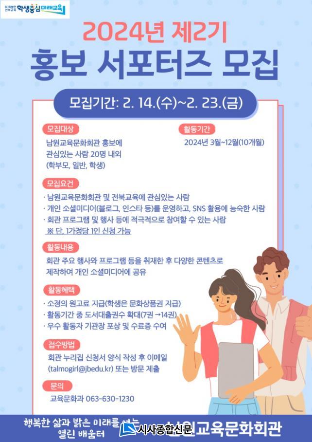 [½Ã»çÁ¾ÇսŹ® = ±è¿¬Èñ ±âÀÚ] ³²¿ø±³À°¹®Èȸ°ü(°üÀå ¹Ú¼öÁø)Àº ¼Ò¼È¹Ìµð¾î¸¦ ÅëÇØ ´Ù¾çÇÑ È¸°üÀÇ ¼Ò½ÄÀ» ¾Ë¸®°í ȸ°üÀÇ Àνĵµ Á¦°í¸¦ À§ÇØ¡®2024³â Á¦2±â È«º¸ ¼Æ÷ÅÍÁ¸¦ ¿À´Â 23ÀϱîÁö ¸ðÁýÇÑ´Ù.