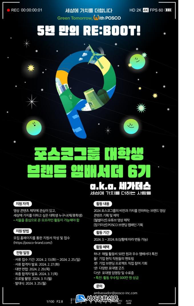 Æ÷´ë¾Ú 6±â ¸ðÁý ´ë»óÀº ¼¿ïÀ» Áß½ÉÀ¸·Î Ȱµ¿ÀÌ °¡´ÉÇÑ ´ëÇб³ À硤ÈÞÇлý À¸·Î, ¡â¿µ»ó±âȹ(´ëº»ÀÛ¼º/¿¬Ãâ) ¡â¿µ»óÃÔ¿µ ¡â¿µ»óÆíÁý ¡â¿µ»óÂü¿©(¿¬±â/MC) µî ºÐ¾ßº°·Î ¼¼ºÐÈÇØ ¸ðÁýÇÑ´Ù. Âü¿©¸¦ Èñ¸ÁÇÏ´Â ´ëÇлýÀº Æ÷´ë¾Ú °ø½Ä »çÀÌÆ®(https://posco-brand.com/)¿¡¼ Áö¿ø¼¸¦ ÀÛ¼ºÇÑ µÚ 2¿ù 25ÀϱîÁö Á¦ÃâÇÏ¸é µÈ´Ù. 1Â÷ ÀüÇü °á°ú´Â °ø½Ä »çÀÌÆ®¿Í °³º° ¾È³»¸¦ ÅëÇØ ¹ßÇ¥µÈ´Ù.