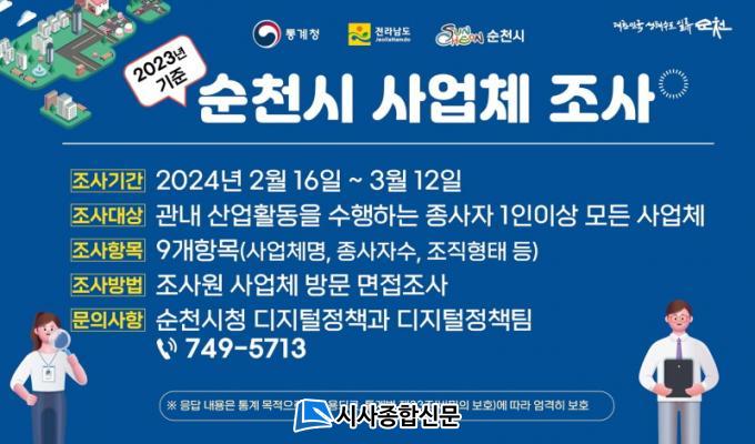 Á¶»ç´ë»óÀº 2023³â 12¿ù ¸»À» ±âÁØÀ¸·Î ¼øÃµ½Ã¿¡¼ »ê¾÷Ȱµ¿À» ¼öÇàÇÏ´Â 1ÀÎ ÀÌ»óÀÇ »ç¾÷üÀÎ 3¸¸ 6,373°³¼Ò´Ù. Á¶»çÇ׸ñÀº »ç¾÷ü¸í, Á¾»çÀÚ ¼ö, Á¶Á÷ÇüÅÂ, â¼³¿¬¿ù, »ç¾÷ÀÇ Á¾·ù µî 9°³ Ç׸ñÀ¸·Î, ½Ã°¡ ÀÓ¸íÇÑ 44¸íÀÇ Åë°èÁ¶»ç¿øÀÌ »ç¾÷ÀåÀ» ¹æ¹®ÇÏ¿© Áú¹®ÇÏ´Â ÇüÅ·ΠÁøÇàµÈ´Ù.