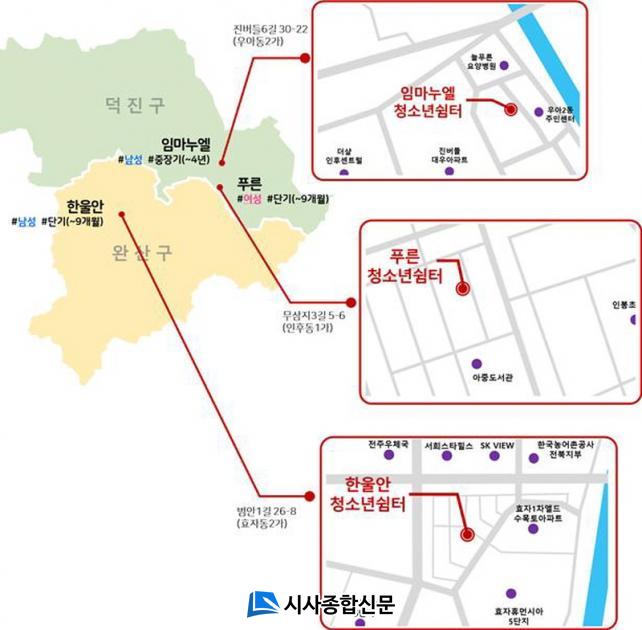 û¼Ò³â½°ÅÍ´Â °¡Á¤ ¹Û û¼Ò³â¿¡ ´ëÇÏ¿© °¡Á¤¡¤Çб³¡¤»çȸ·Î º¹±ÍÇÏ¿© »ýȰÇÒ ¼ö ÀÖµµ·Ï ÀÏÁ¤ ±â°£ º¸È£ÇÏ¸é¼ »ó´ã¡¤ÁÖ°Å¡¤Çо÷¡¤ÀÚ¸³ µîÀ» Áö¿øÇϴ û¼Ò³â ½Ã¼³ÀÌ´Ù. ÀüÁÖÁö¿ª¿¡´Â ÀÓ¸¶´©¿¤Ã»¼Ò³â½°ÅÍ¿Í Çª¸¥Ã»¼Ò³â½°ÅÍ µî ´öÁø±¸ 2°³¼Ò¿Í ÇÑ¿ï¾Èû¼Ò³â½°ÅÍ µî ¿Ï»ê±¸ 1°³¼Ò µî ÃÑ 3°÷ÀÇ Ã»¼Ò³â½°ÅͰ¡ ¿î¿µµÇ°í ÀÖ´Ù.