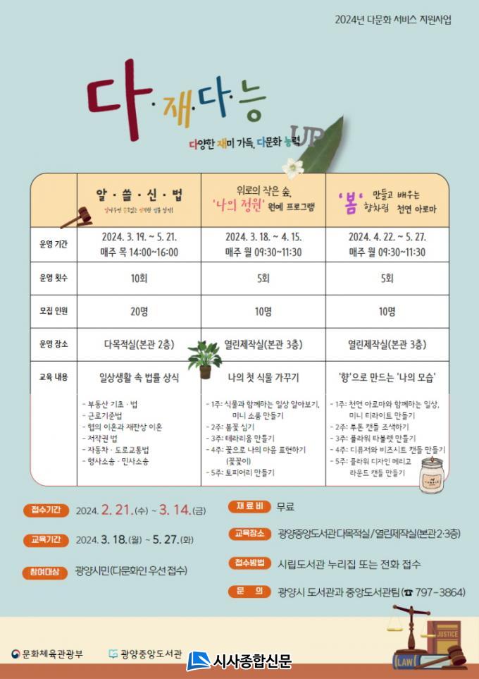 ÇÑÆí, ±¤¾çÁß¾Óµµ¼°üÀº Áö³ÇØ¿¡µµ ¡º´Ù¹®È ¼ºñ½º Áö¿ø»ç¾÷¡» °ø¸ð¿¡ ¼±Á¤µÅ ¡¸´Ù(Òý)ÇÔ²² ÀâÀâÀâ(job)!¡¹À» ÁÖÁ¦·Î ´Ù¹®ÈÀεéÀÌ °æÁ¦ Ȱµ¿ ±â¹ÝÀ» ¸¶·ÃÇÒ ¼ö ÀÖµµ·Ï Áö½Ä°ú ±â¼ú ½Àµæ ±³À° °Á¸¦ ¿î¿µÇÑ ¹Ù ÀÖ´Ù.