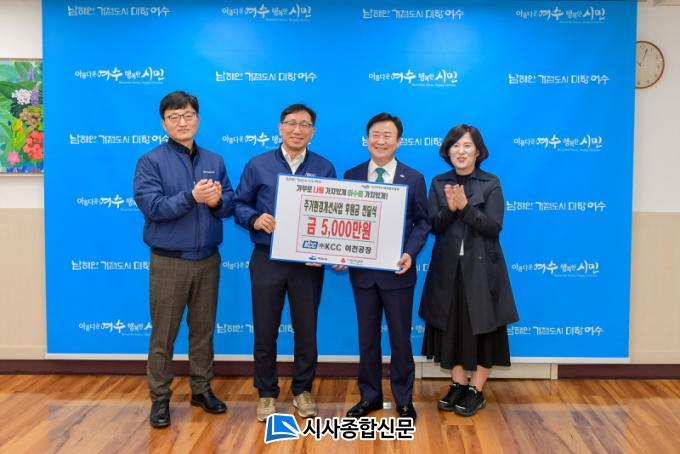 [½Ã»çÁ¾ÇսŹ® = ¿À½ÂÅà ±âÀÚ] ¿©¼ö½Ã(½ÃÀå Á¤±â¸í)´Â (ÁÖ)KCC ¿©Ãµ°øÀå(°øÀåÀå Àå°æ±â)ÀÌ Áö³ 20ÀÏ º¹ÁöÀ§±â°¡±¸ ÁÖ°Åȯ°æ °³¼±À» À§ÇÑ ¼º±Ý 5õ¸¸ ¿øÀ» ±âŹÇß´Ù°í ¹àÇû´Ù.